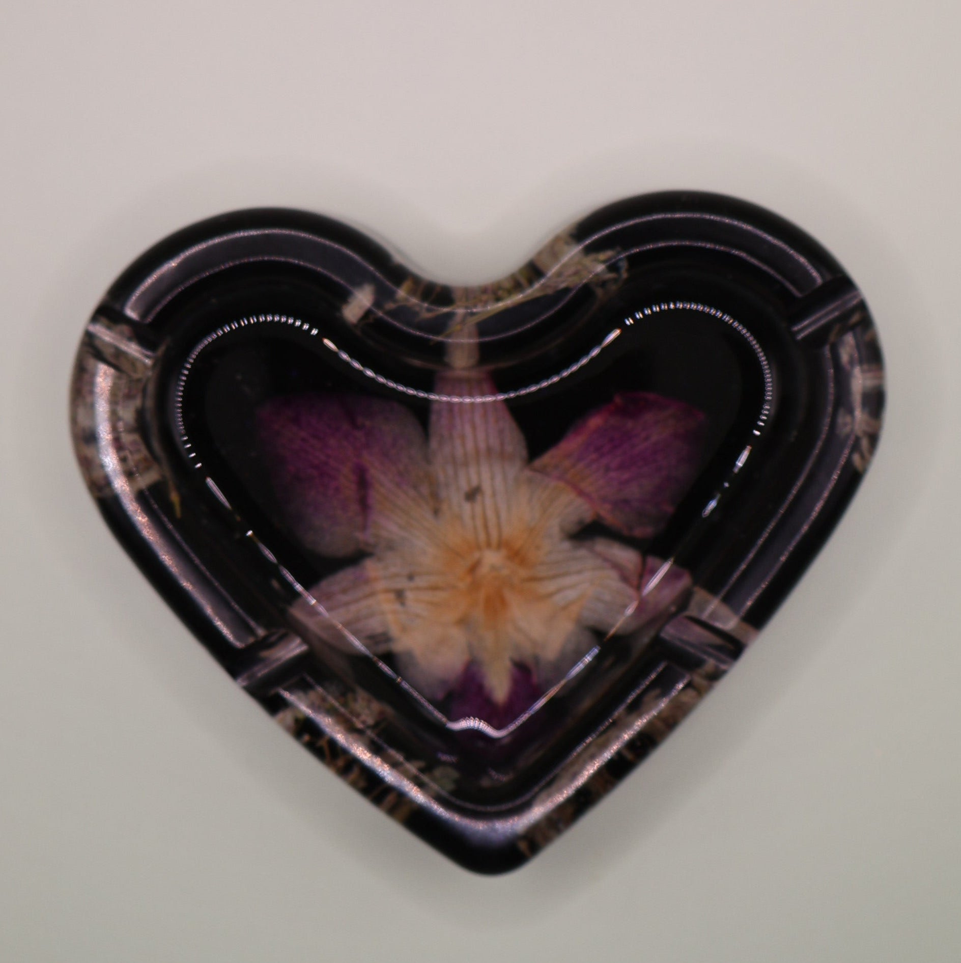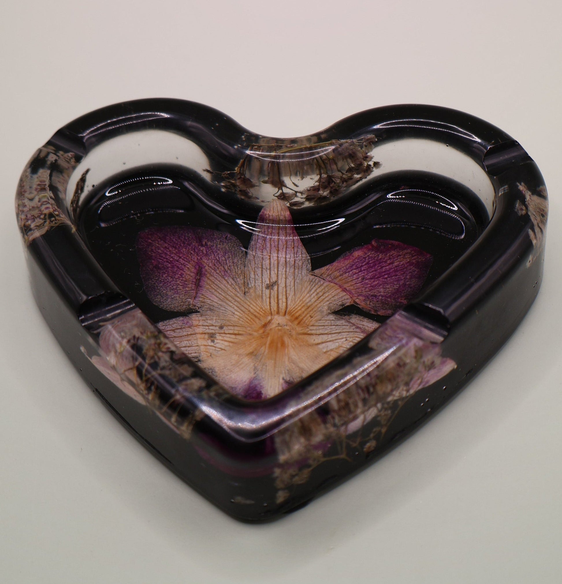 Bold and graceful, this handcrafted heart-shaped ashtray features a deep black resin base with scattered white flowers and a striking pink orchid at the center. A perfect blend of contrast and softness, it’s both functional and decorative — made to stand out with elegance and heart.