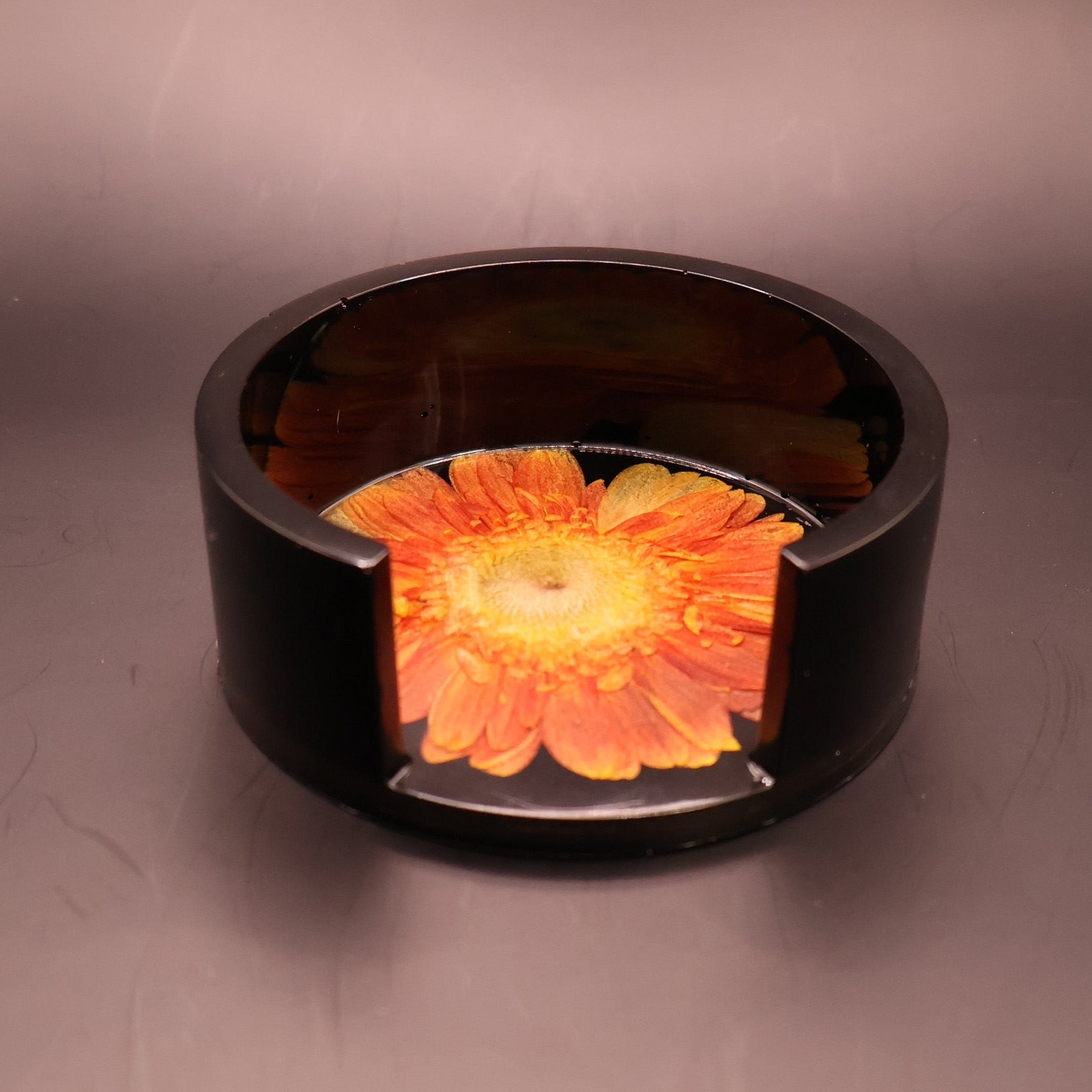 Bold and full of warmth, this round coaster set features a deep black base that makes the orange and yellow florals glow beautifully. The contrast feels vibrant and energetic, like sunset tones captured in a modern, circular design. Striking yet inviting, they instantly elevate any table.
