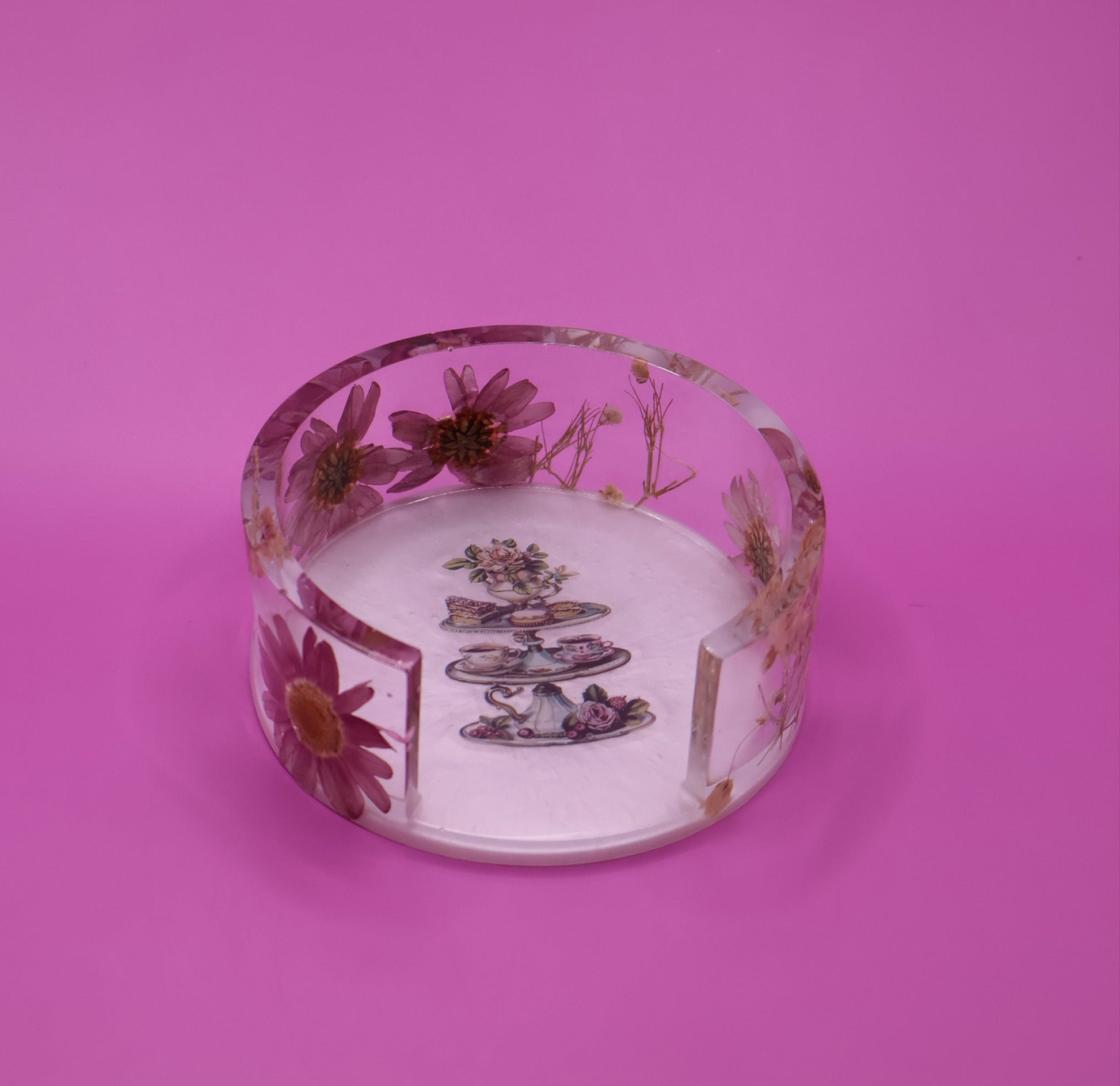 Grace and nostalgia come together in this handcrafted set of 4 resin coasters. Featuring a pristine white base decorated with soft pink roses and elegant vintage ballet dancer motifs, these coasters add a touch of timeless beauty and delicate charm to any table.