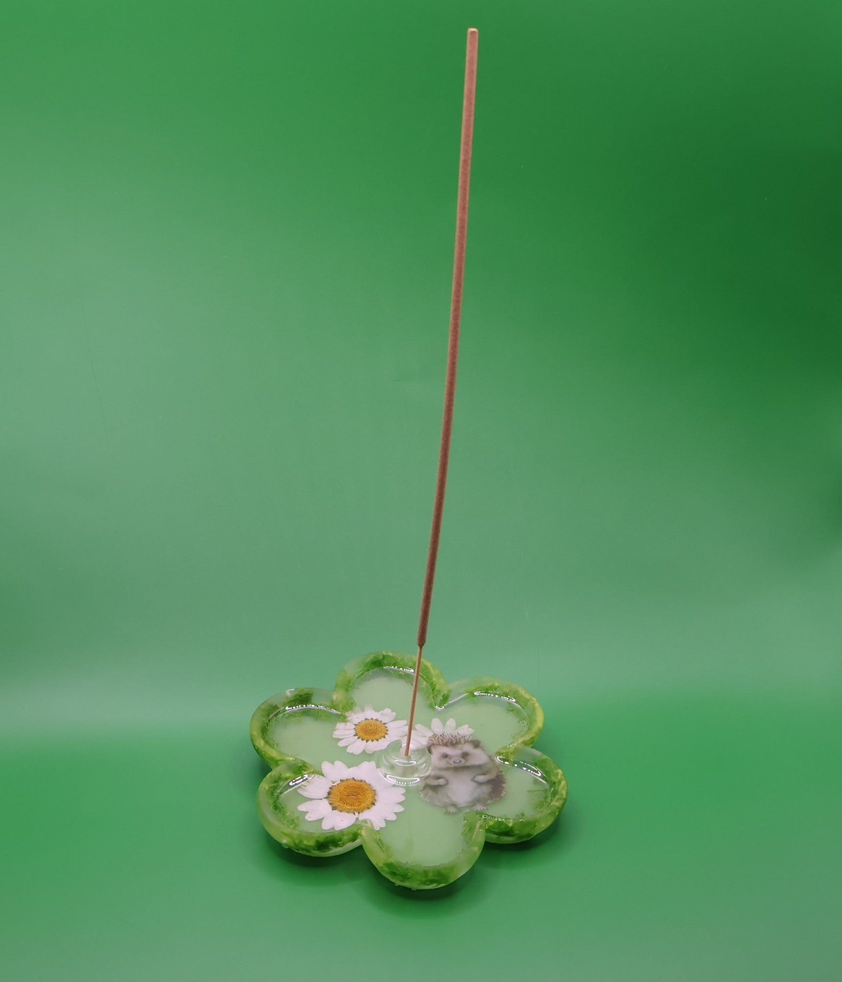 Handmade with a green resin base, soft green moss, three delicate white flowers, and a tiny hedgehog, this incense holder captures the charm of a peaceful woodland scene.