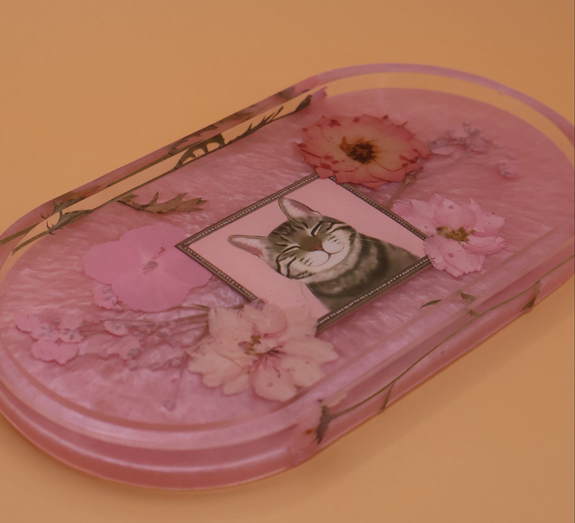 With soft pink tones throughout, this tray features a charming cat at its center, surrounded by delicate real pink flowers. A gentle, heartwarming piece that brings a touch of whimsy and comfort to any corner.