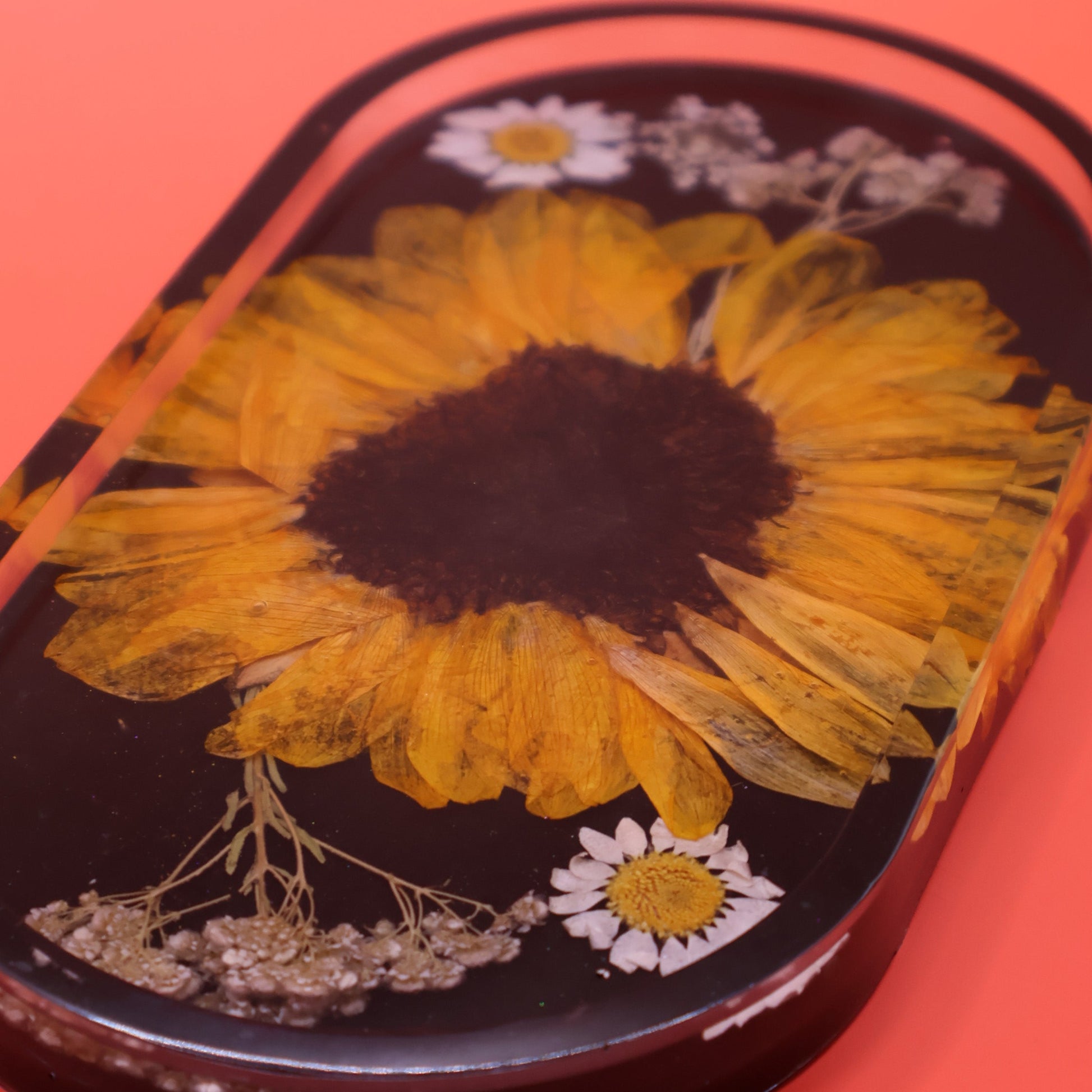 Set against a deep black base, radiant sunflowers burst with life alongside delicate white blossoms, creating a striking contrast that commands attention. This tray is both a statement piece and a celebration of nature’s beauty—perfect for serving or display.