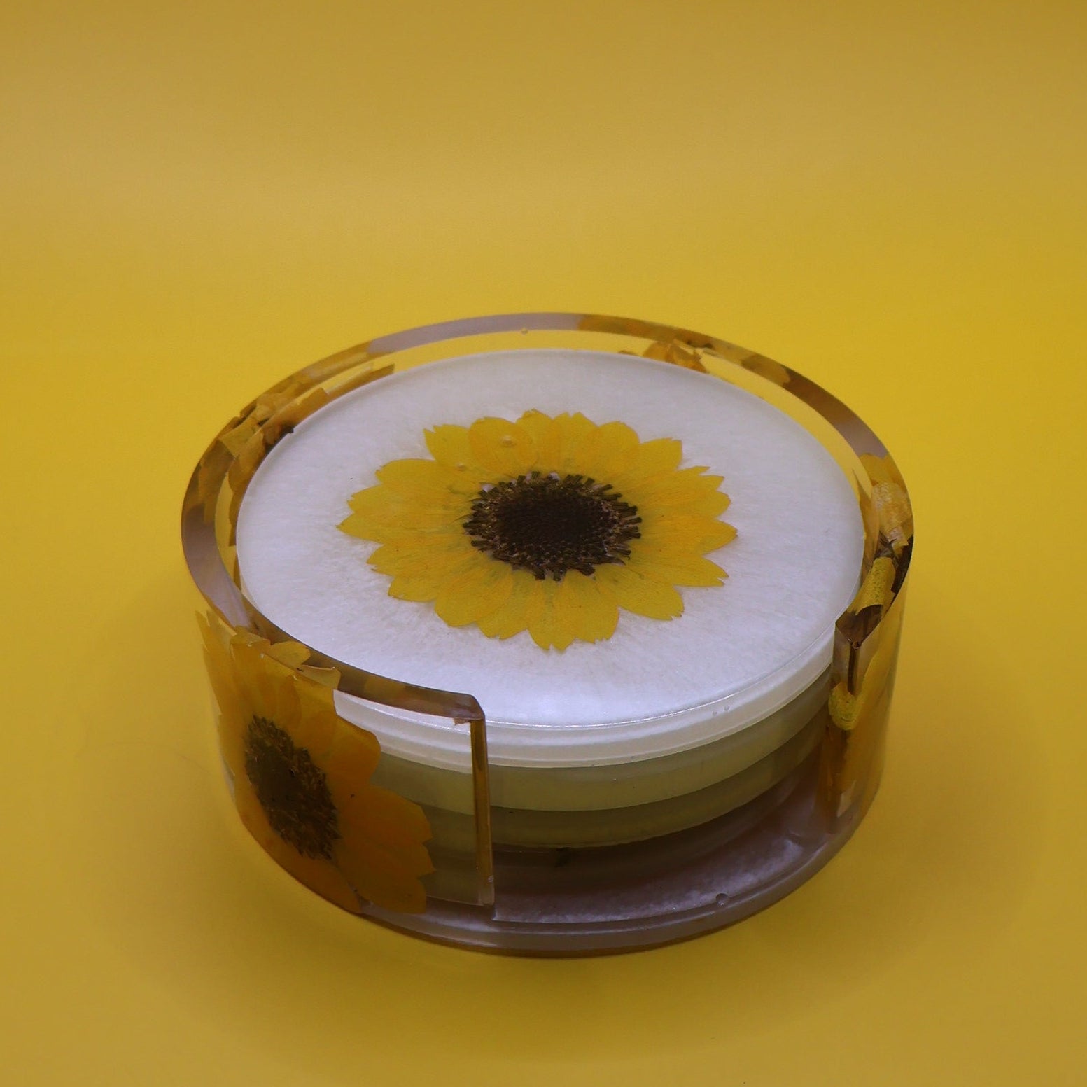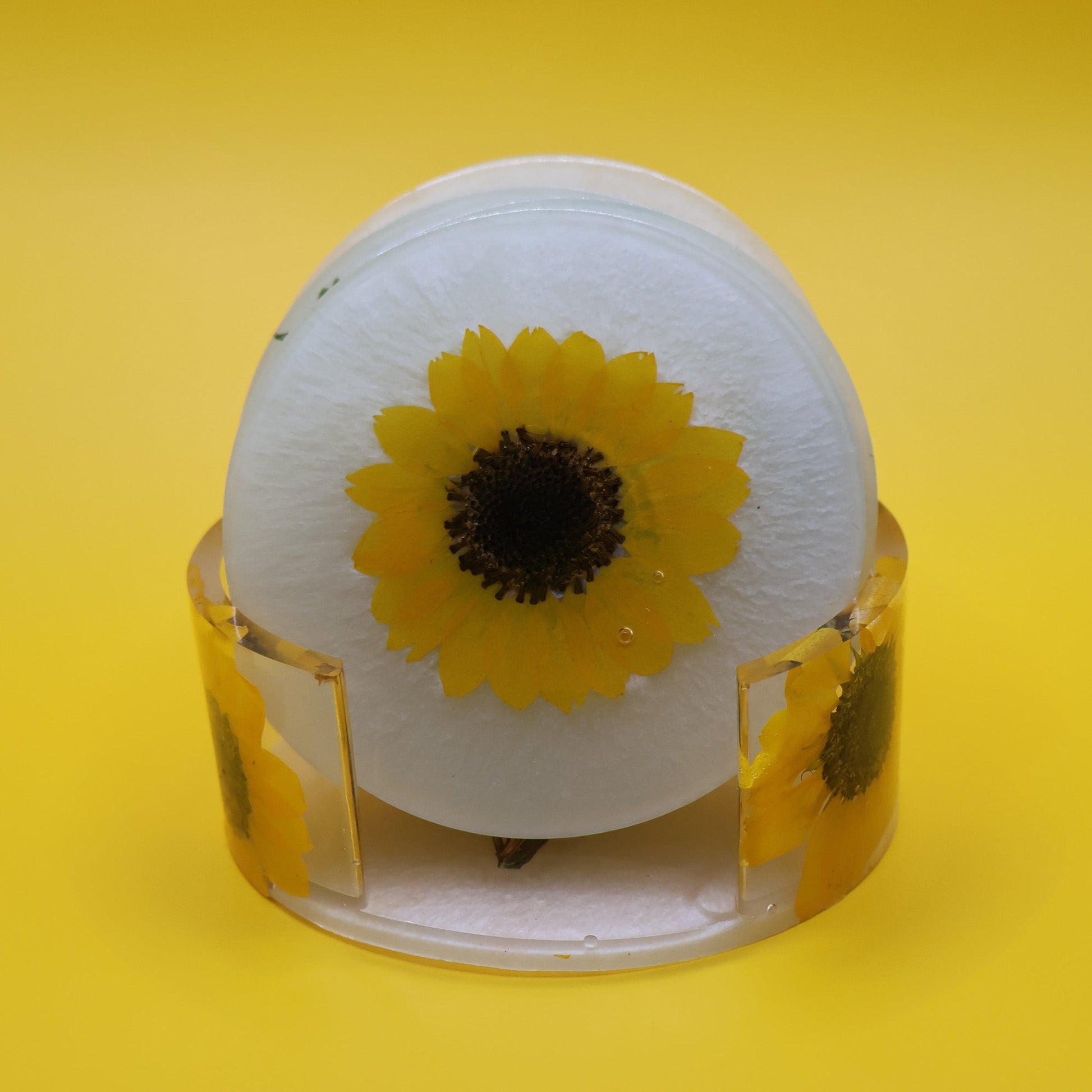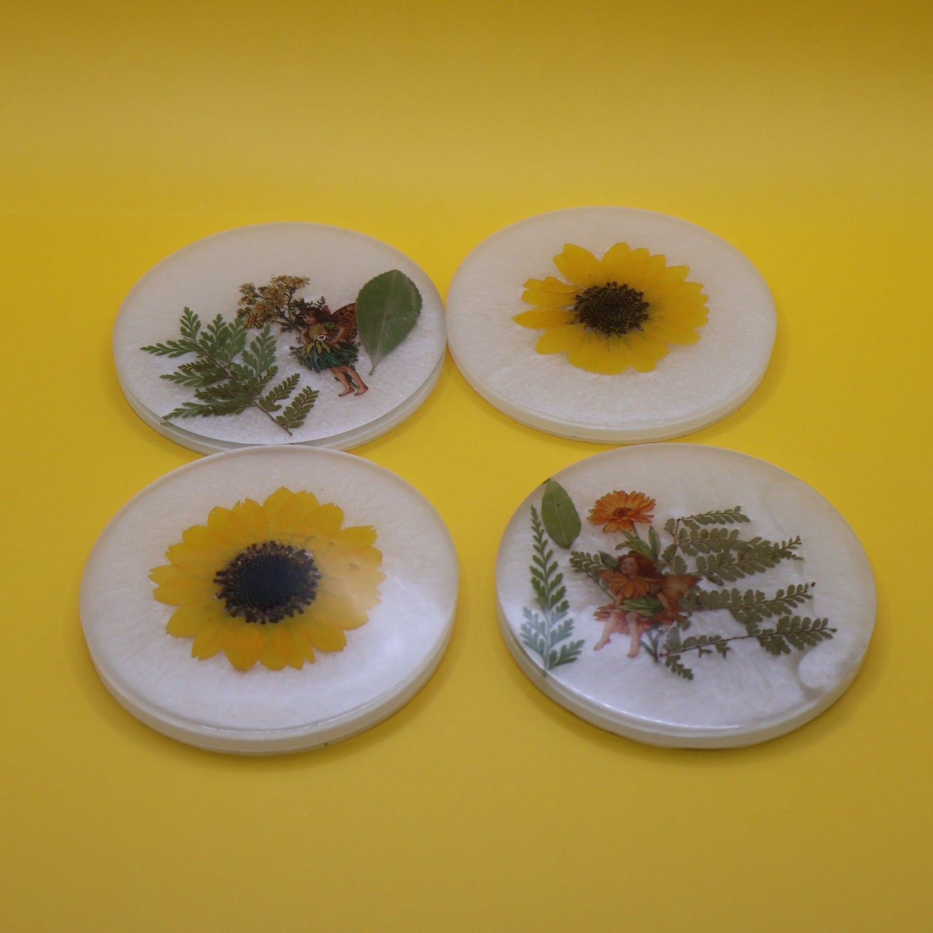 Bring a touch of whimsy and sunshine to your table with this handcrafted set of 4 resin coasters. Featuring a clean white base, two coasters showcase vibrant sunflowers, while the other two highlight delicate fairies surrounded by lush green botanicals. A magical blend of nature and fantasy, perfect for brightening up any gathering.