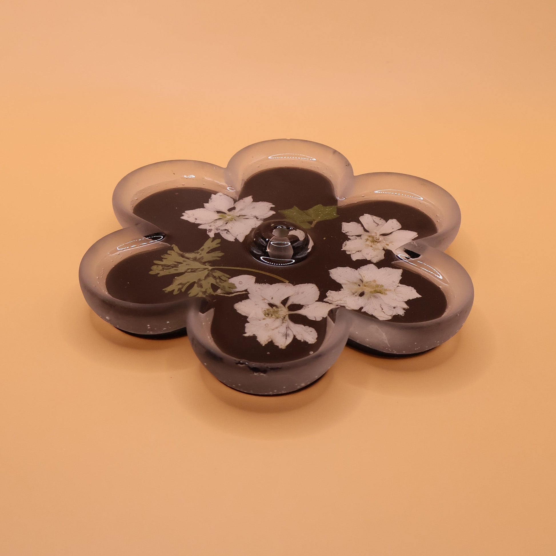 Delicate in shape yet bold in contrast, this flower-shaped incense holder features a deep black base that allows the white florals to stand out beautifully. The sculpted silhouette feels soft and organic, while the dark backdrop keeps it modern and refined. Designed to hold your incense gracefully, it turns each ritual into a small, intentional moment.