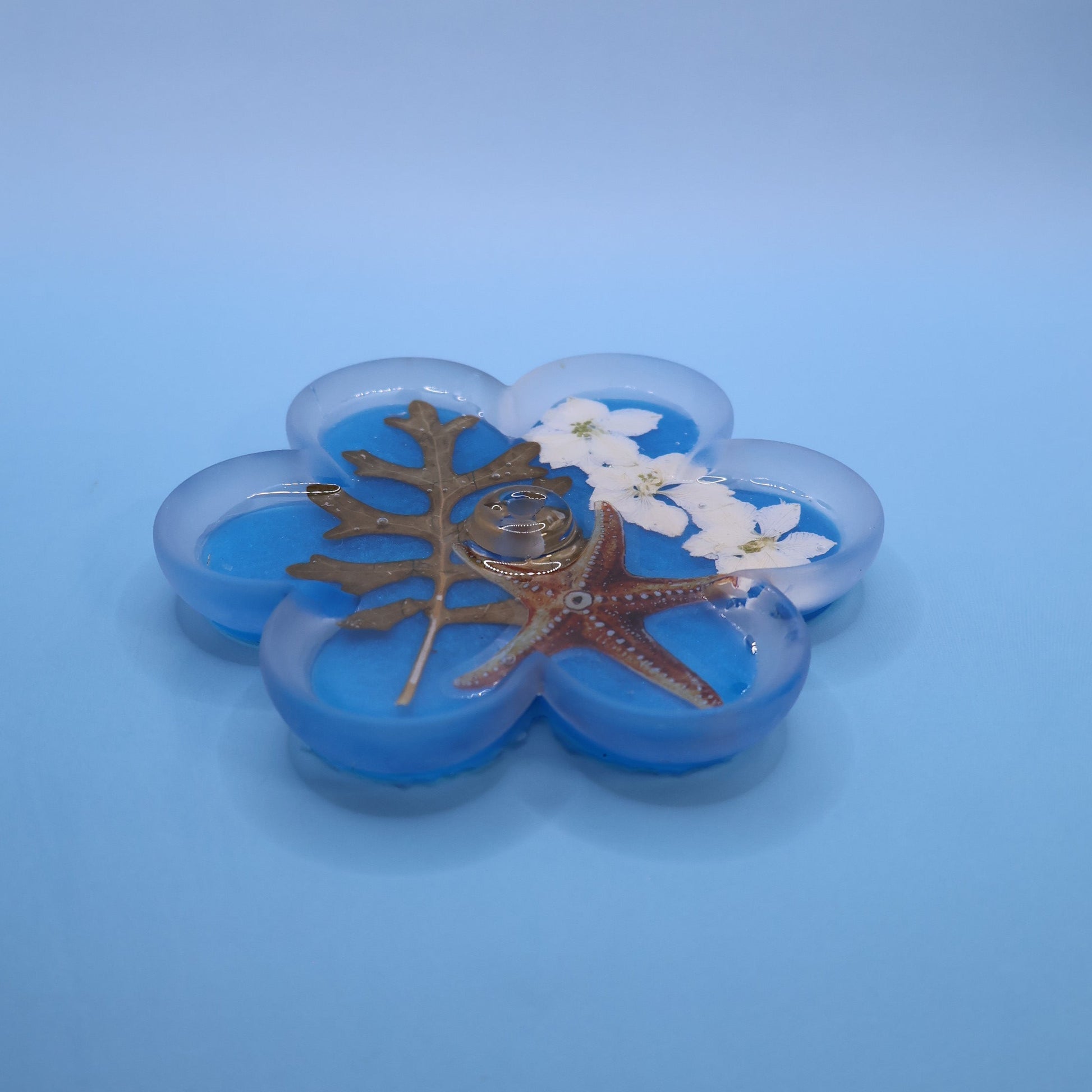 Dreamy and ocean kissed, this incense holder features a serene blue base layered with delicate florals and a small starfish detail that brings a subtle coastal charm. It feels like a quiet beach moment captured in resin, calm, fresh, and softly magical.