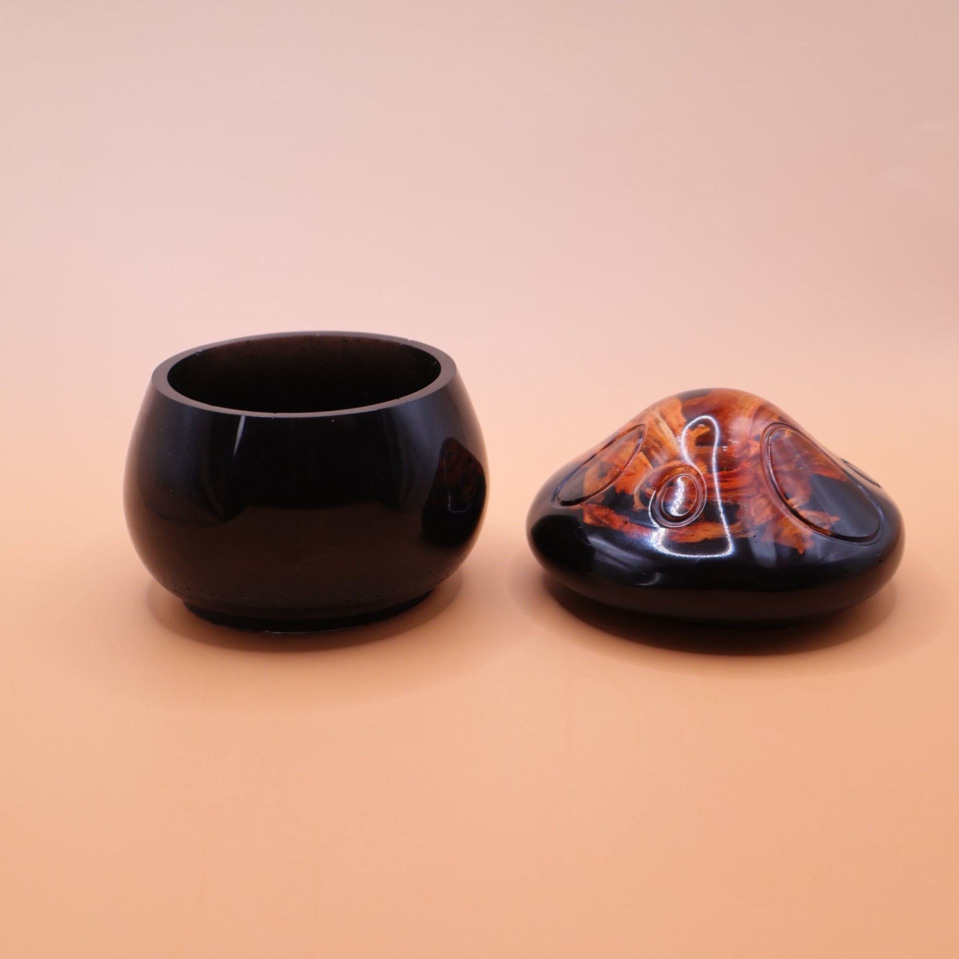 A deep black resin mushroom with a bright orange flower on top — and a secret compartment inside. Perfect for storing rings, crystals, or little keepsakes, it brings cozy autumn vibes to any corner.
