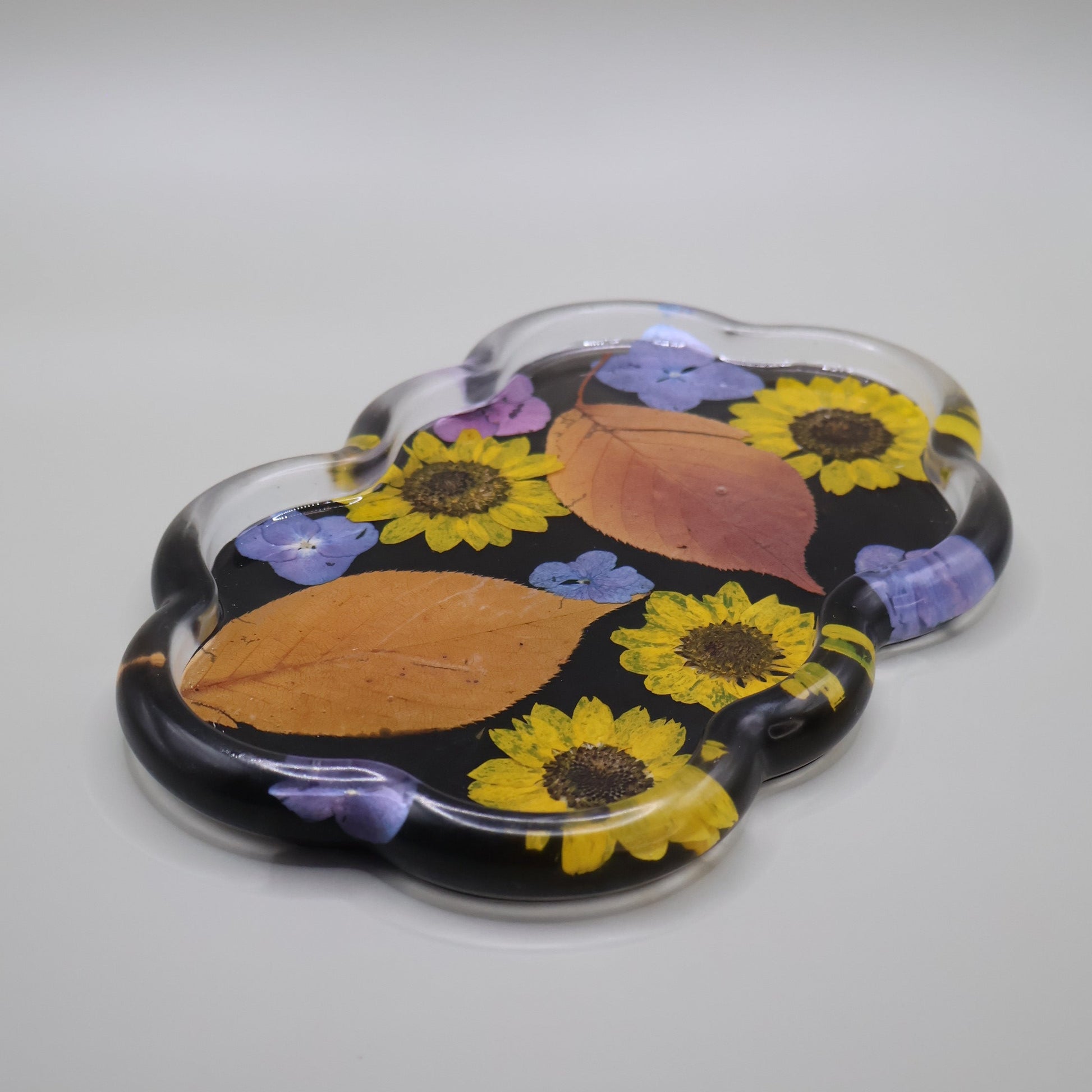 Bring the golden glow of fall into your home with this handcrafted resin tray, featuring real sunflowers and autumn leaves. Warm, earthy, and full of seasonal charm, it's perfect for displaying your favorite pieces or adding a cozy, nature-inspired touch to any space.